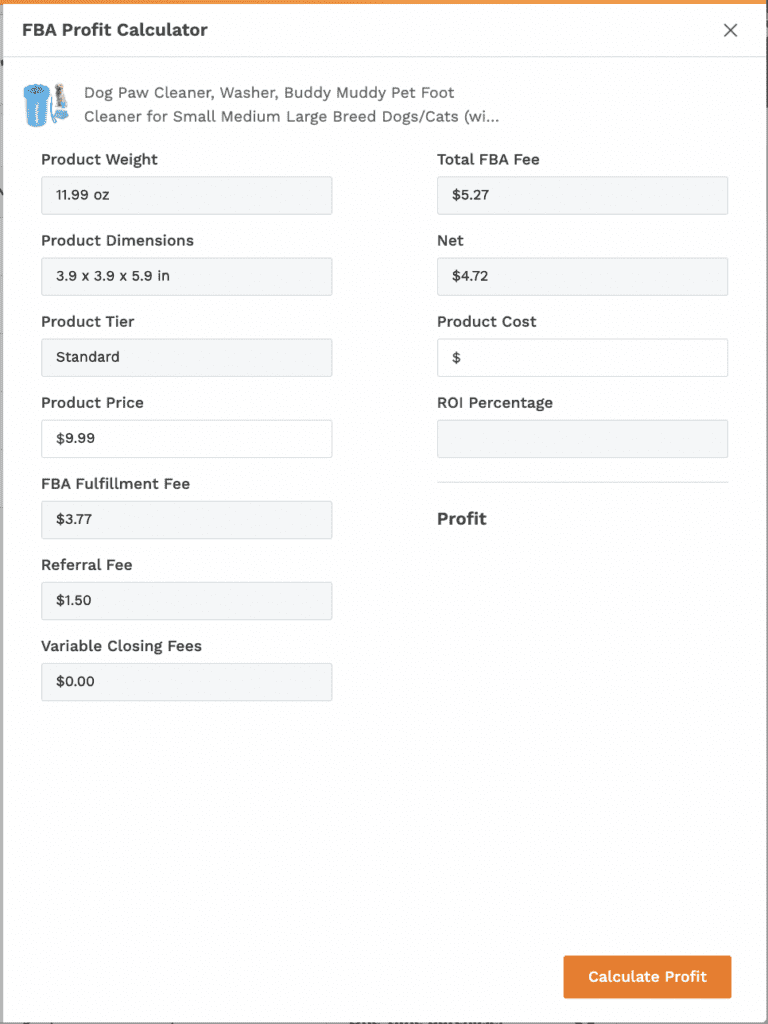 The Amazon FBA Revenue Calculator tool allows you to estimate your profit on any item listed on Amazon. If you are interested in selling a particular item, first enter the ASIN of the product into the calculator. Then enter relevant information such as selling price, buy price, etc.