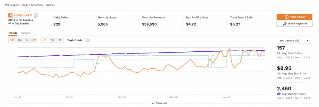 The Extension will also display a graph on the Amazon product detail page right above the title. The graph will display the monthly sales and a historical trends chart. This chart shows historical data points such as Buy Box price, New lowest price, BSR, Amazon’s price, daily sales, ratings, and more.