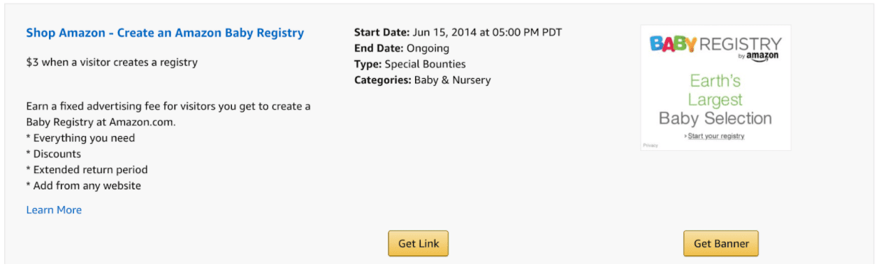 The Amazon Bounty Program offers fixed commissions — or bounties — for each specific service promoted by an affiliate or influencer. For example, if you get a visitor to your Influencer page to create a Baby Registry with Amazon, you will receive $3 from Amazon.