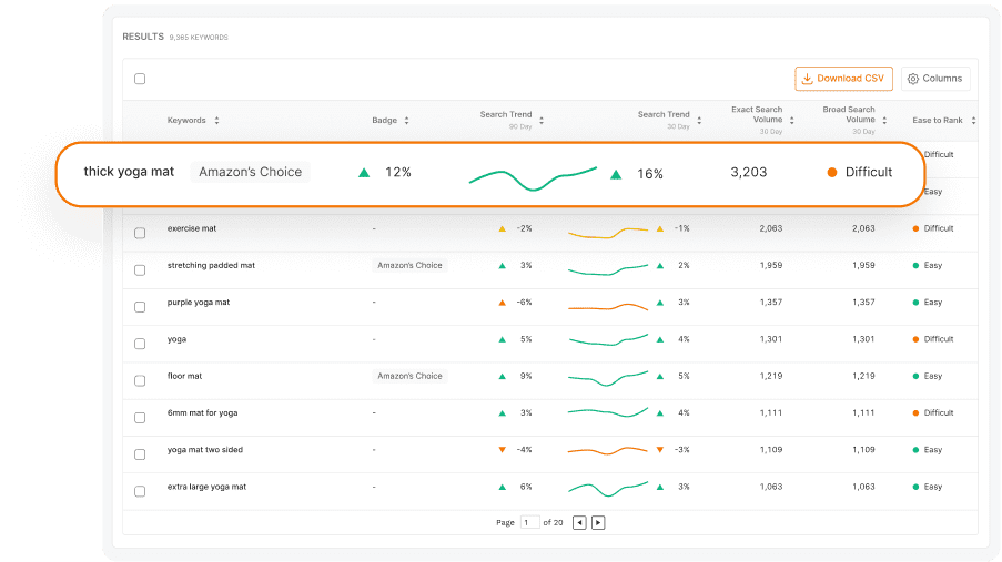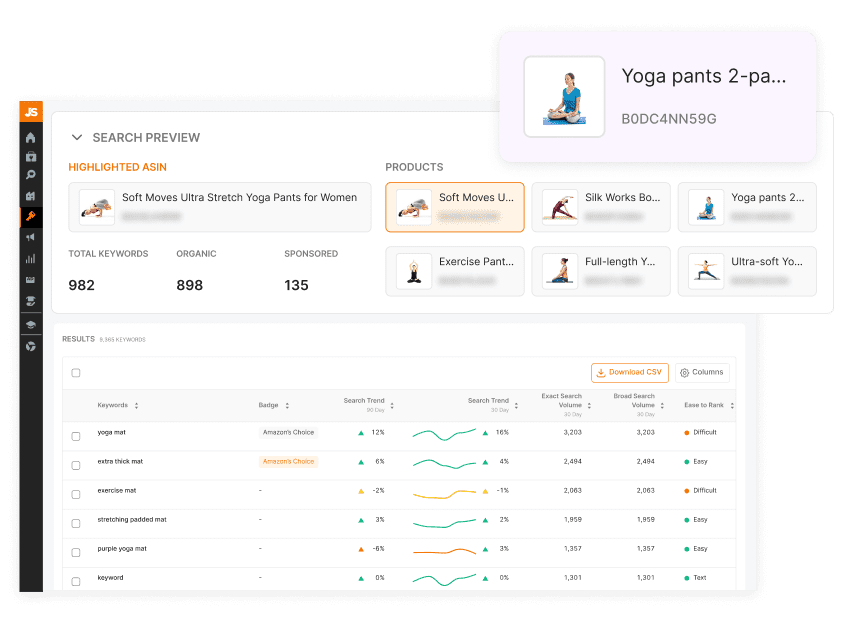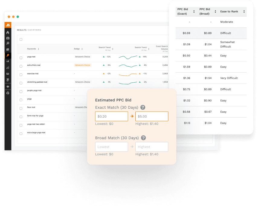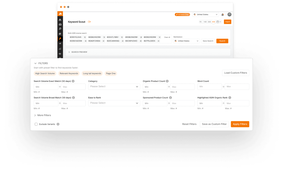 Keyword Scout pulls millions of data points to show you exact and broad keyword search volumes. Find quality keywords and reverse-search competing ASINs for organic and sponsored keyword ranking data.