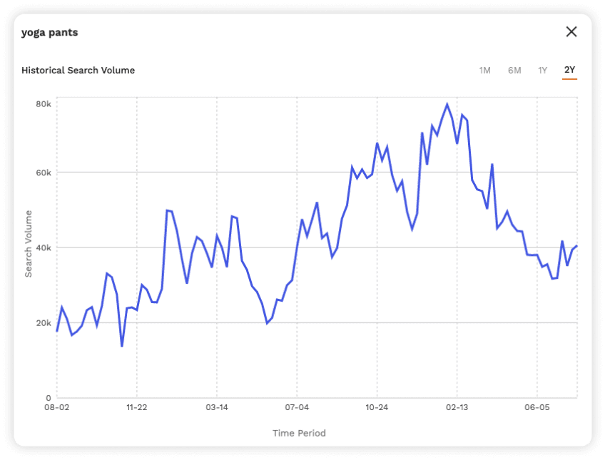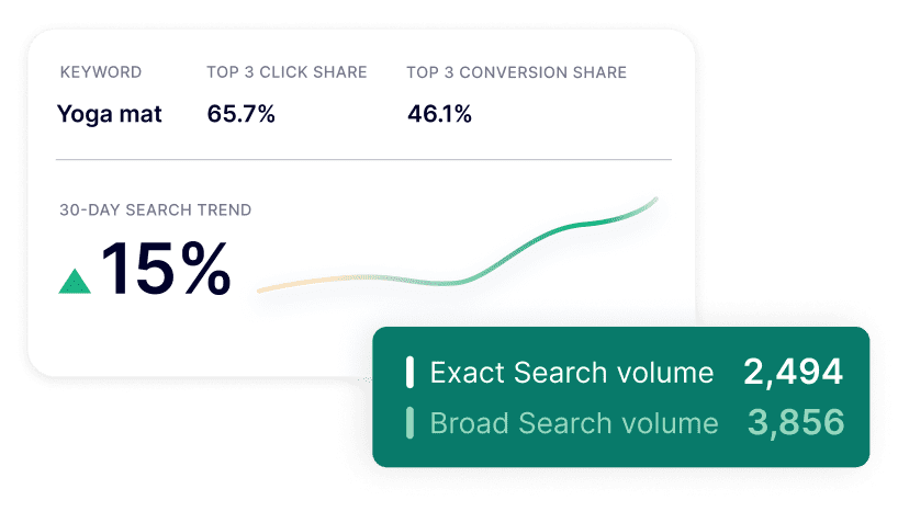 Analyze past keyword performance for up to two years and view monthly and quarterly trend data. Use this information to generate a full picture of a product’s seasonality and popularity over time, adjust PPC campaigns, and optimize listings.