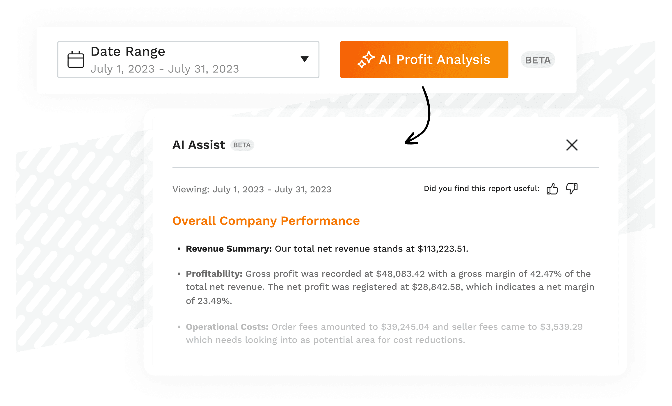 AI Assist analyzes your Profit Overview data including revenue, cost of goods sold, fees, and more. It instantly delivers a comprehensive report a Chief Financial Officer would be proud of, featuring need-to-know insights and tips for ways you can improve your sales and optimize for growth.