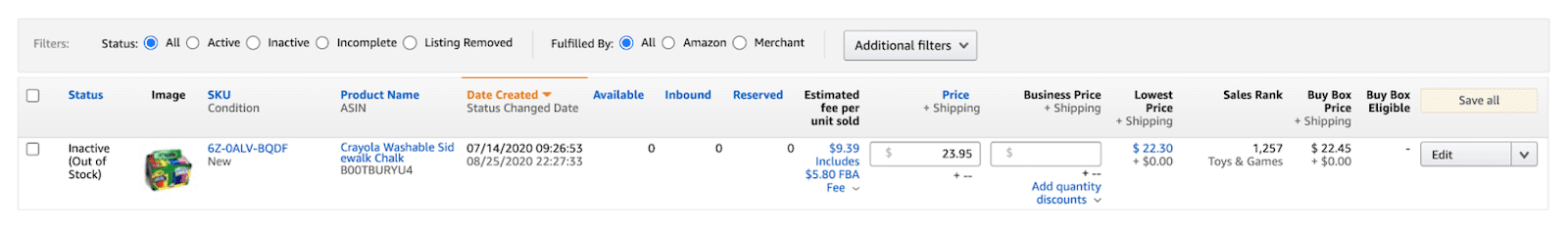 This is what you will see in your Manage Inventory. The status will show as “Inactive” because you do not yet have any inventory at Amazon’s warehouse.