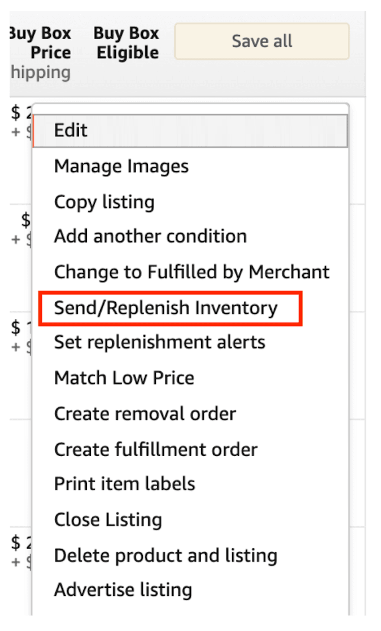 On the far right, you will see “Edit” and a drop-down menu. Click the drop-down arrow and choose “Send/Replenish Inventory.”
