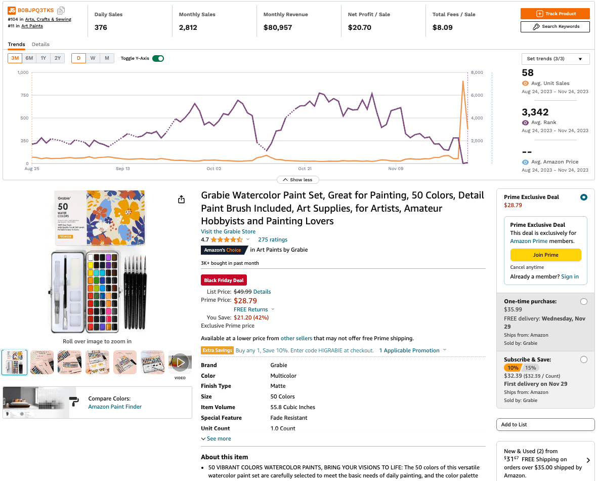 These watercolors performed very well on Black Friday and Cyber Monday, following a 55% reduction in price with sales increases of 572% and 180% respectively.