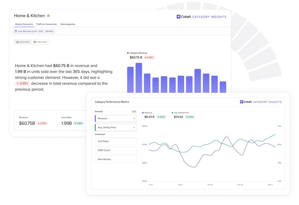 Now available in Jungle Scout Cobalt, Category Insights delivers real Amazon sales trend data at the category and subcategory level—updated weekly and monthly to help solve for the aforementioned use cases many businesses are trying to solve for. With Category Insights, you can: