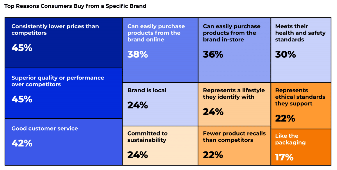 54% of consumers would describe themselves as brand loyal. So what’s the top reason that consumers buy from a specific brand? Tied for first is consistently lower prices than competitors and superior quality over competitors, followed closely by good customer service.